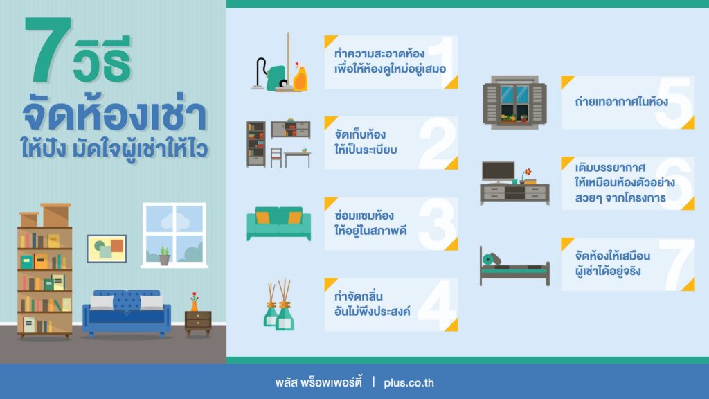 สำหรับนักลงทุนคอนโดที่ ลงทุนซื้อคอนโด เพื่อทำกำไรในการปล่อยเช่าคอนโดนั้น การให้ความสำคัญกับการตกแต่งห้องเช่าให้ดูมีราคา และน่าอยู่อาศัย จะช่วยสร้างบรรยากาศให้ผู้เช่าอยากอยู่อาศัยและตัดสินใจเช่าได้ง่ายขึ้น เคล็ดลับสำคัญ ที่ทำได้ง่ายๆ เพื่อดึงดูดความสนใจของผู้เช่า ไม่ให้สามารถปฎิเสธได้ ทำได้ด้วยวิธีดังนี้ 1. ทำความสะอาดห้องเพื่อให้ห้องดูใหม่อยู่เสมอ ความประทับใจแรกเป็นสิ่งสำคัญเมื่อผู้เช่ามาเยี่ยมชมห้องของเราเป็นครั้งแรก ห้องที่ดูสะอาดสะอ้านจะทำให้รู้สึกถึงความน่าอยู่อาศัย ดังนั้นเจ้าของห้องควรเตรียมทำความสะอาดห้องให้ปราศจากฝุ่นและคราบสกปรกต่างๆ โดยเฉพาะอย่างยิ่งตามหน้าบานกระจกต่างๆ หน้าต่างห้อง รวมถึงกระจกในห้องน้ำ และตู้อาบน้ำ เพราะหากทิ้งคราบอันไม่น่าพึงประสงค์ไว้แล้ว จะทำให้ห้องดูเก่า และขาดการดูแล ไม่น่าอยู่อาศัย ทำความสะอาดให้ห้องดูใหม่อยู่เสมอ เพื่อการปล่อยเช่าคอนโดให้ได้ง่ายขึ้น 2. จัดเก็บห้องให้เป็นระเบียบ หากการนัดเยี่ยมชม เป็นห้องที่ยังมีผู้พักอาศัยอยู่ หรือเรายังพักอาศัยอยู่ในห้องนั้น แต่ต้องการปล่อยเช่าคอนโดควรทำการจัดเก็บข้าวของเครื่องใช้ให้เป็นระเบียบ เก็บสิ่งของไม่จำเป็นเข้าตู้ให้เรียบร้อย จัดเก็บที่นอน พับผ้าห่ม คลุมผ้าคลุมเตียงให้ดูน่านอน รวมถึงล้างจานชามที่อยู่ในครัว และนำขยะมีกลิ่นไปทิ้ง เพื่อสร้างบรรยากาศที่ดีให้กับห้องดูน่าอยู่อาศัย 3. ซ่อมแซมห้องให้อยู่ในสภาพดี บ่อยครั้งจุดเสียหายเล็กๆ น้อยๆ ภายในห้อง ก็สามารถทำให้ผู้เช่าตัดสินใจไม่เช่าห้องได้ เพราะกลัวเกิดความเสียหายเพิ่มมากขึ้นเมื่อเข้าพักอาศัย และทำให้ถูกปรับโดยการยึดเงินประกัน อีกหนึ่งความสำคัญที่ควรให้ความสำคัญในการปล่อยเช่าคอนโด คือควรทำการซ่อมแซมเฟอร์นิเจอร์ หรือ อุปกรณ์ต่างๆ ที่ชำรุดให้อยู่ในสภาพดี เช่น ซ่อมโซฟาที่ขาด ทำการเก็บสีบนผนังที่หลุดลอก เปลี่ยนหลอดไฟให้ใช้งานได้ ซ่อมท่อน้ำที่ตัน เพื่อให้ผู้เช่ามั่นใจได้ว่า จะไม่มีปัญหาเกิดขึ้นเมื่อย้ายเข้ามาพักที่ห้องนี้ 4. กำจัดกลิ่นอันไม่พึงประสงค์ กลิ่น เป็นสิ่งที่ช่วยสร้างสัมผัสแรกที่ดี อีกทั้งช่วยสร้างบรรยากาศและเพิ่มมูลค่าให้กับคอนโดปล่อยเช่าได้ การใช้น้ำหอมปรับอากาศ หรือเปิดเครื่องทำอโรม่า โดยใช้กลิ่นธรรมชาติ อ่อนๆ เช่น กลิ่นลาเวนเดอร์ กลิ่นทุ่งหญ้า จะช่วยสร้างบรรยากาศให้น่าอยู่อาศัยมากขึ้น แต่ควรระวังไม่ใช้กลิ่นที่มีความฉุนและกลิ่นแรง เพราะอาจจะทำให้เวียนหัวได้ 5. ถ่ายเทอากาศและอุณหภูมิในห้อง 