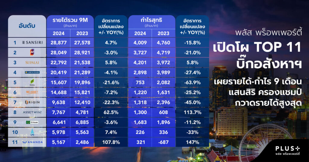 พลัส พร็อพเพอร์ตี้ เปิดโผ TOP 11 บิ๊กอสังหาฯ เผยรายได้-กำไร 9 เดือน