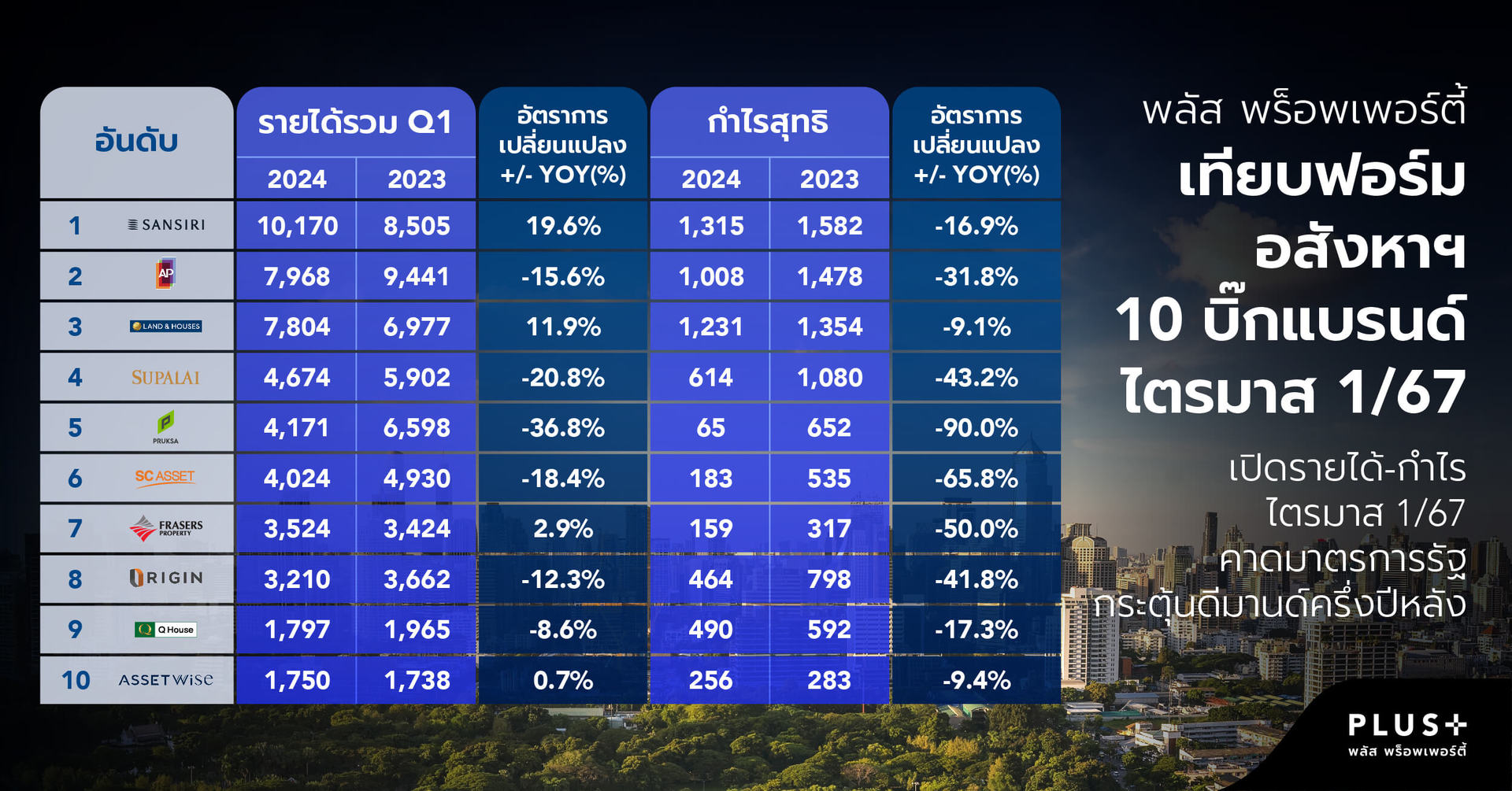 พลัส พร็อพเพอร์ตี้ ชี้ให้เห็นถึงแนวโน้มของเศรษฐกิจไทยปี 2567 ที่มีความท้าทาย 10 บริษัทบิ๊กแบรนด์ในธุรกิจอสังหาฯ ประกาศผลประกอบการไตรมาสแรก ทำรายได้รวมมากกว่า 4.9 หมื่นล้านบาท เมื่อเทียบกับปี66 ในช่วงเวลาเดียวกันยังมีรายได้รวมที่ต่ำกว่าเล็กน้อย ถือเป็นปีที่ผู้ประกอบการในธุรกิจอสังหาฯต้องใช้ความระมัดระวังในการบริหารจัดการ