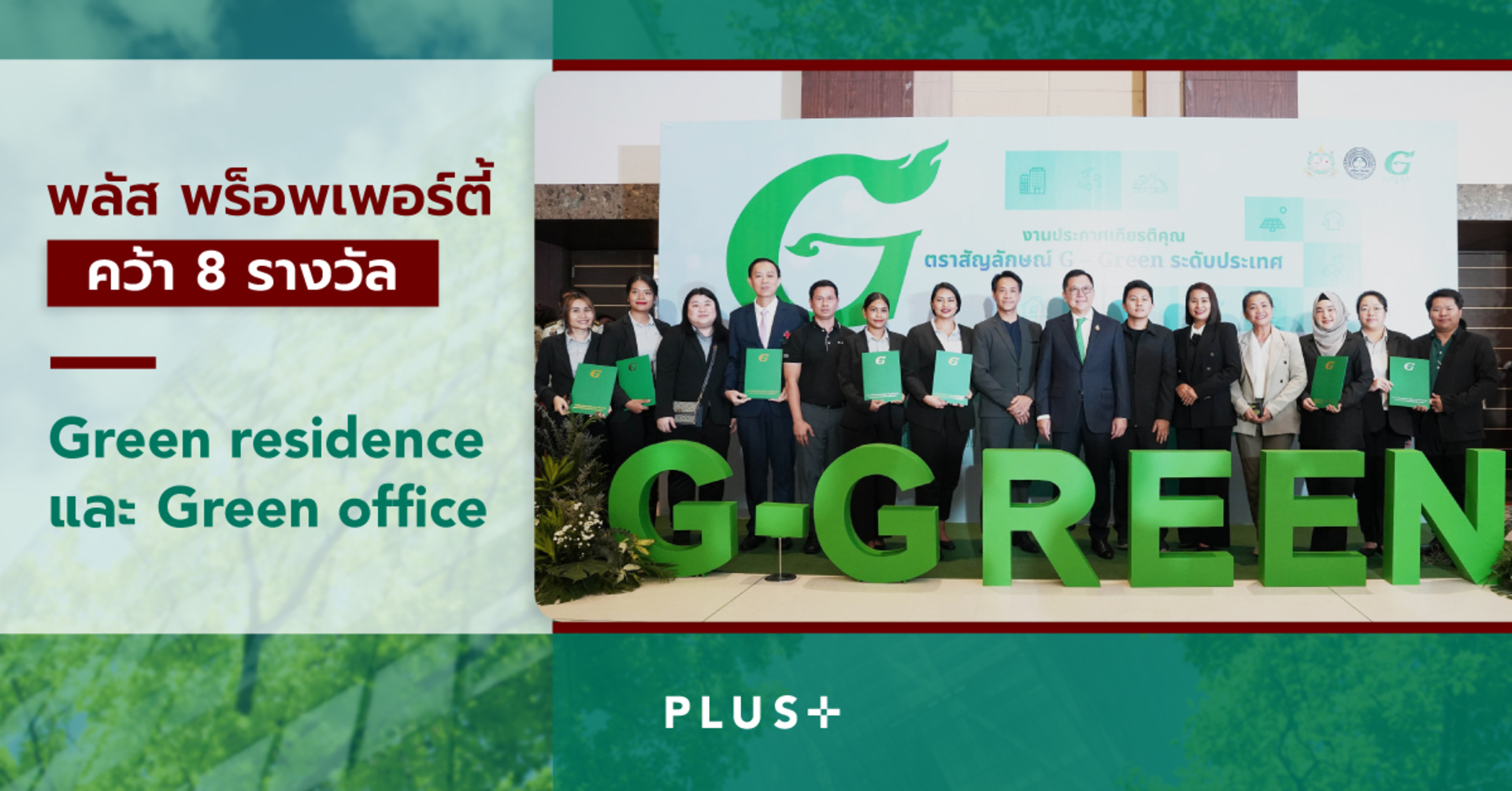พลัส พร็อพเพอร์ตี้ พาโครงการที่อยู่อาศัยและอาคารที่บริหารจัดการ คว้ารางวัลตราสัญลักษณ์ G-Green ระดับประเทศ ทั้งสิ้น 8 รางวัล ประเภทโครงการส่งเสริมที่อยู่อาศัยที่เป็นมิตรกับสิ่งแวดล้อม (Green Residence) และ โครงการส่งเสริมสำนักงานสีเขียว (Green Office) สะท้อนถึงความมุ่งมั่นของพลัสฯ ในการส่งเสริมด้านสิ่งแวดล้อมและความยั่งยืนอย่างเป็นรูปธรรม